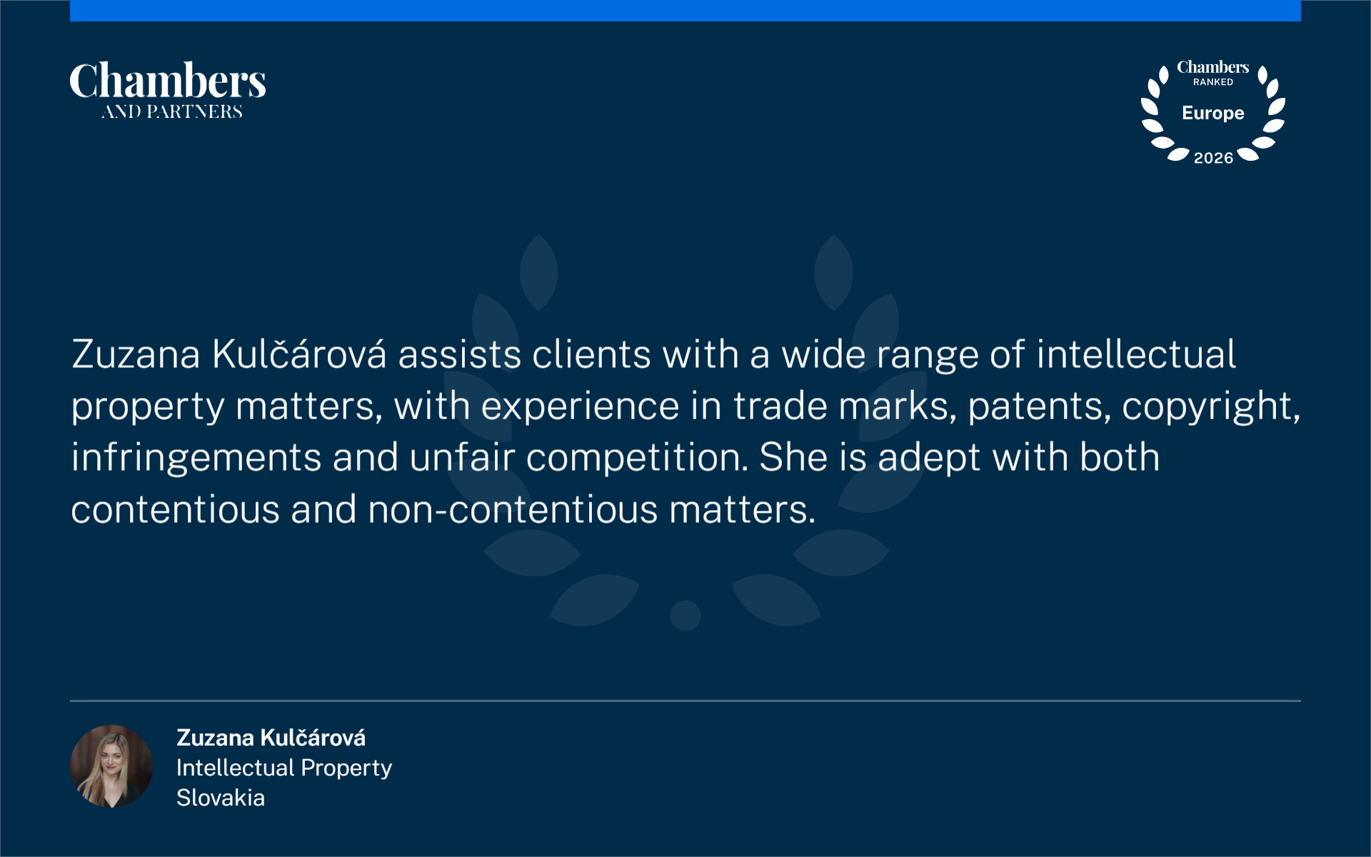 Chambers Europe 2026: Zuzana Kulčárová je „Associate to Watch“ v oblasti práva duševného vlastníctva